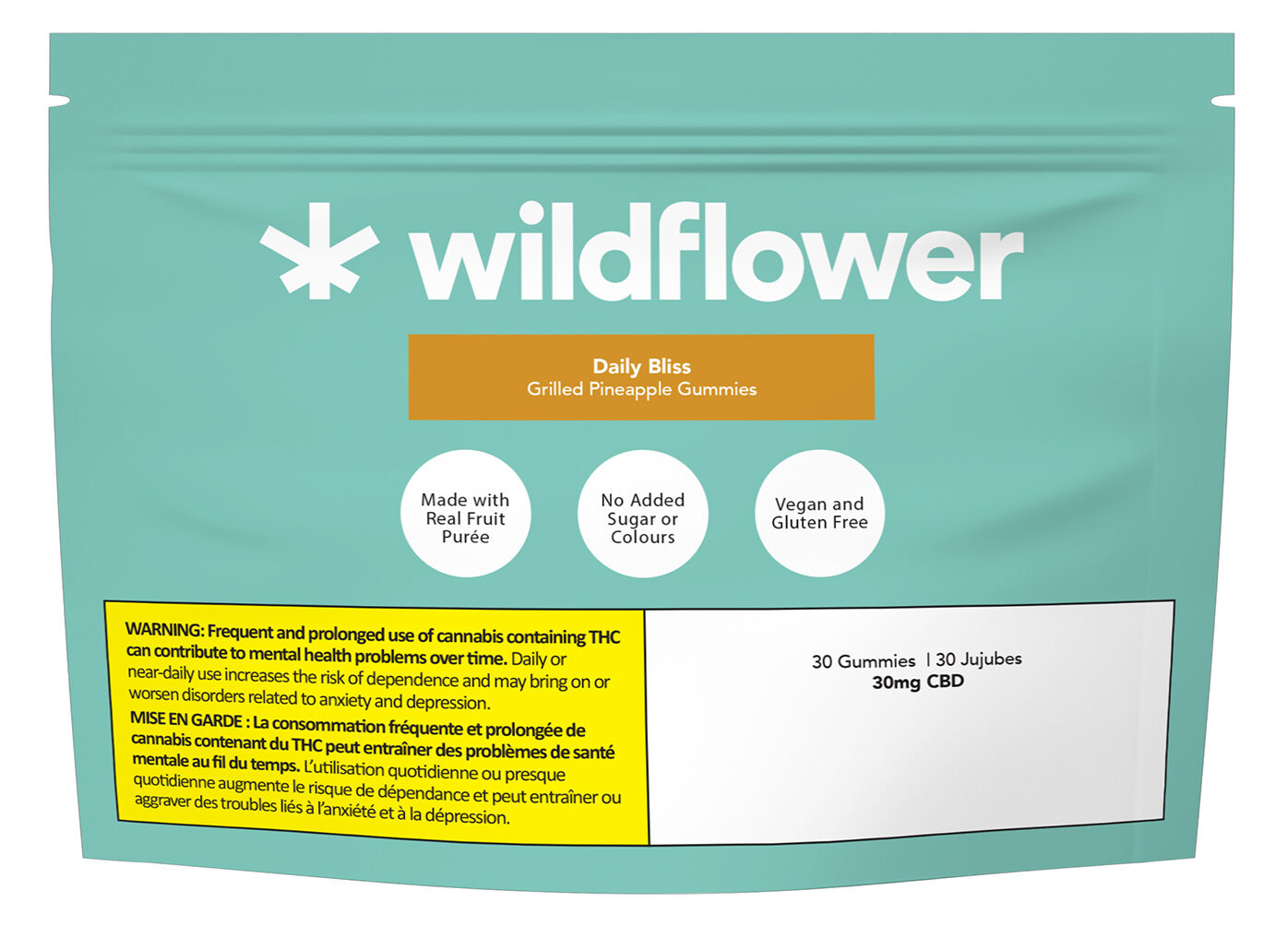 Our Grilled Pineapple Wildflower Daily Bliss gummies are naturally sweetened with real fruit purée, vegan, and gluten free. Each of the 30 gummies has 30 mg of CBD. These ingredients combined will be the Daily Bliss you need during the day.