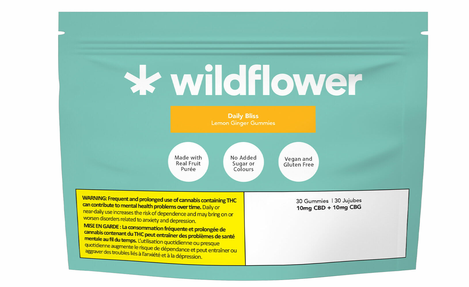 Our Lemon Ginger Wildflower Daily Bliss gummies are naturally sweetened with real fruit purée, vegan, and gluten free. Each of the 30 gummies has 10 mg of CBD, and 10 mg of CBG. These ingredients combined will be the Daily Bliss you need during the day.